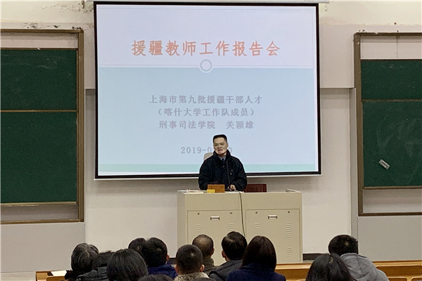 关颖雄介绍了自己在新疆喀什工作的基本情况以及感悟和收获。作为援疆干部,他在喀什大学承担了学院教学、科研、指导学生等工作,担任学生党支部书记、联系少数民族学生,做好援疆维稳和学生党组织建设工作。关颖雄表示,对口援疆属于国家战略,是必须长期坚持的指导方针,自己身为援疆队伍中的一员,倍感荣耀与自豪。他表示将进一步发扬援疆精神,更好立足本职工作,为华政的教育事业发展作出自己应有的贡献。