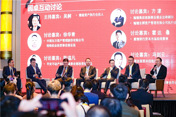 下半场圆桌互动环节由德富资产执行合伙人吴舸主持,中国东方资产管理股份有限公司特殊机会投资事业部总监徐华青、平安不动产长租公寓事业部投资部总监陈溢凡、翰德集团高级副总裁方濛、戴德梁行资本市场部助理董事霍达、博思恩资本创始合伙人冯剑云和北京市中伦(上海)律师事务所合伙人赵丙印参与讨论。