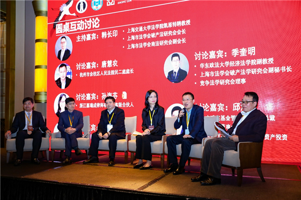 上半场圆桌互动环节由上海市法学会破产法研究会会长、上海交通大学凯原法学院特聘教授韩长印主持,杭州市余杭区人民法院民二庭庭长唐慧农、我校经济法学院副教授季奎明、东方瑞宸基金管理有限公司总裁邱海斌、浙江嘉瑞成律师事务所高级合伙人孙海芬、北京市中伦(上海)律师事务所合伙人杨飞翔等五位分享嘉宾就房地产企业破产重整实务问题进行了多维度讨论。