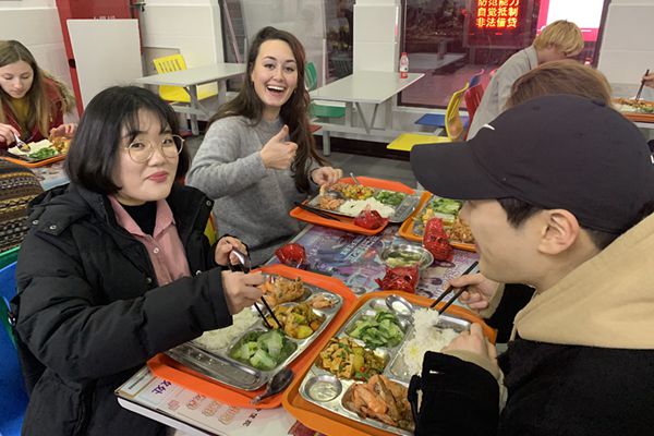 各国学生漫步雨中,参观校园,一边了解学校设施,一边体会我校优美的建筑风情。傍晚,学生在河东食堂享用了来到中国的第一顿晚餐。