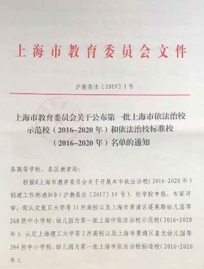 近日,第一批上海市依法治校示范校(2016-2020年)名单公布,我校成功入选。此次评估共产生了279所上海市依法治校示范校,包括11所高等院校和268所中小学校、幼儿园,华东政法大学附属中学也成功入选。