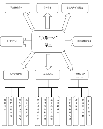四是建立切实有效的维权体系,保障师生合法权益。我校始终将保护学生权益放在首位,坚持依法管理学生。我校建立了“八维一体”学生维权体系,包括“校长信箱”“部门接待日”“学代表常任制”“权益维护站”“团支部权益委员”“‘青年之声’服务平台”“学生处分听证制度”“学生就业维权”。2018年,在汇总听证、申诉制度推行以来近20年经验的基础上,修订、出台《华东政法大学听证规则(试行)》和《华东政法大学学生申诉处理规定(试行)》,进一步完善了学生听证、申诉制度。学校切实保障教师合法权益。关于聘用,学校建立了权利义务明确的教师及其他教职员工聘用制度。关于发展,学校建立了涉及教师职务职称评聘、继续教育、评奖评优、学术不端等惩戒措施等方面的标准及制度。学校2009年制定了《华东政法大学劳动人事争议调解办法》,并设立劳动人事争议调解委员会,对教师与学校发生的纠纷或意见进行调处,作出申诉结论或者调解意见,切实保障教职工的合法权益。