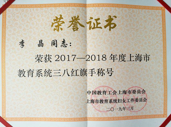 3月6日,上海市教育工会、教育系统妇工委举办了以“奋进新时代,筑梦新天地”为主题的纪念三八国际妇女节109周年暨先进表彰大会。我校国际法学院李晶副教授荣获2017-2018年度上海市教育系统“三八红旗手”荣誉称号。