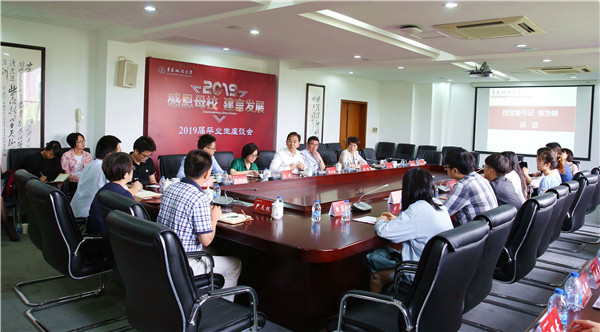 6月11日上午,我校在松江校区明镜楼召开“感恩华政、建言发展”2019届毕业生代表座谈会。校党委书记郭为禄,党委副书记、副校长闵辉出席会议。党委组织部部长戴莹,党委宣传部部长虞潇浩,社会协同合作处处长、团委书记陈赛金,后勤管理处处长高纪忠,保卫处处长周立表,党校办副主任吴江,教务处副处长尹天松,研究生教育院党委副书记周莉以及26位2019届本硕毕业生代表与会。座谈会由学工部(处)部(处)长王戎主持。