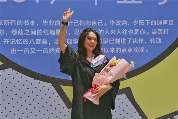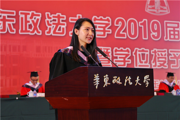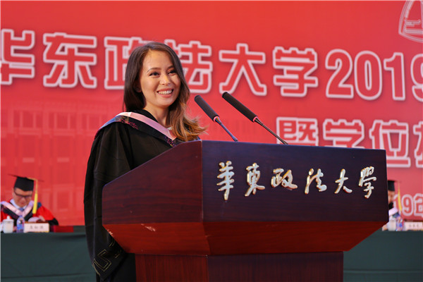 留学生代表、来自吉尔吉斯斯坦的国际法学院毕业生娜娜(NargizaPolotova)回忆了华政四年的学习生活经历,感谢老师和同学的帮助,希望大家能够记住她是在吉尔吉斯斯坦的华政人,并号召毕业生为母校争光,用所学知识建设美好未来。