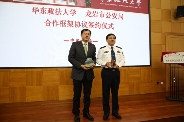 会上,张斌和周立志为华东政法大学法学研究与实践基地揭牌,并互赠纪念品。