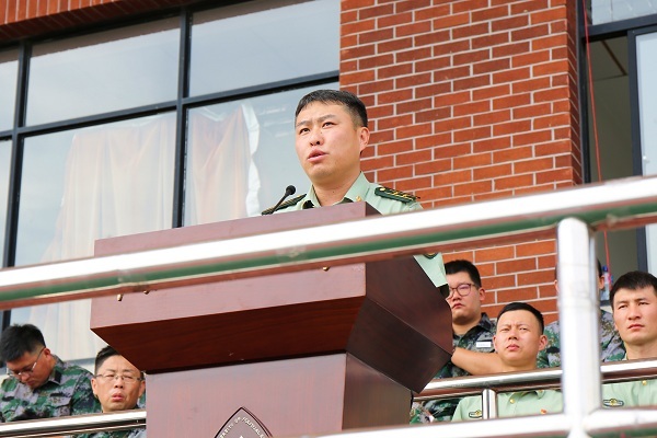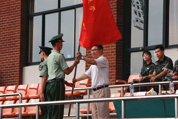 闵辉为军训连授旗。鲍新钢和学工部(处)部(处)长、武装部部长王戎分别作军训动员讲话。军训团一连连长王森森、经济法学院黄许同学分别代表教官和受训学生发言。