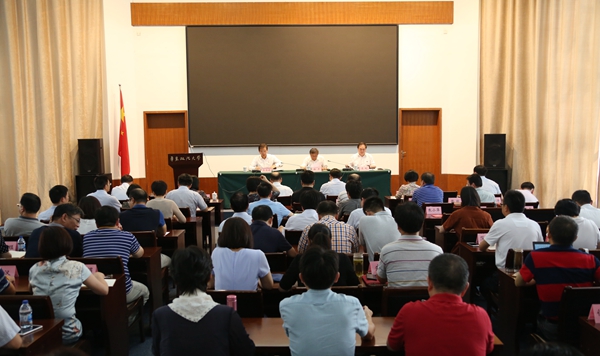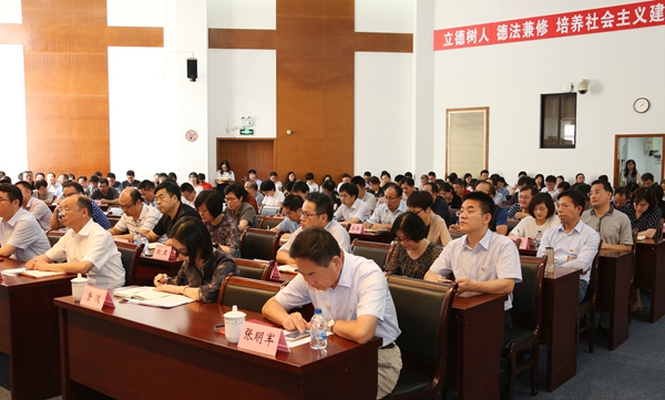 9月11日下午,华东政法大学“不忘初心、牢记使命”主题教育动员部署会在松江校区举行。市委第七巡回指导组组长徐力、副组长凌刚,联络员、组员出席会议。校党委书记郭为禄,校党委副书记、纪委书记应培礼,校党委副书记、副校长闵辉,校党委副书记唐波,副校长陈晶莹、张明军、周立志,近期退下来的校领导、处级干部以及教师职工党员代表、学生党员代表、离退休教职工党员代表185人参加会议。