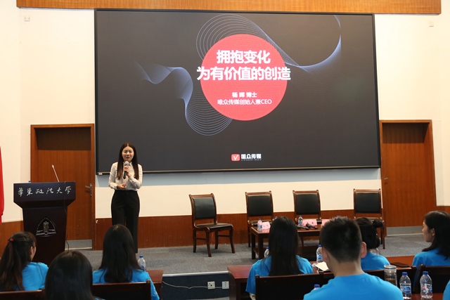 杨晖以“拥抱变化,为有价值的创造”为主题,“一个临时工的故事”“一个双城人生的故事”“一个创业者的故事”三个故事分享了自己的感悟心得。在演讲中,她鼓励大家要学会把喜欢变成擅长,抓住每一个机会,找到属于自己的那条路,坚定地走下去。最后,她呼吁在场00后大学生要与变化共生,与时代共振,用心领悟“内心坚定,拥抱变化”。