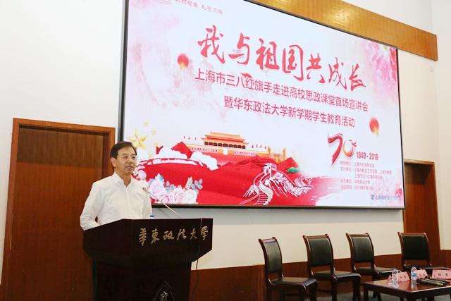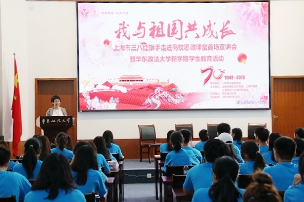 9月18日下午,“我与祖国共成长”上海市三八红旗手走进高校思政课堂首场宣讲会暨华东政法大学新学期学生教育活动在松江校区尚法厅举行。来自沪上的三八红旗手代表与200余名华政师生参加。