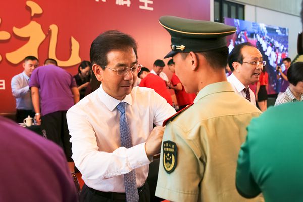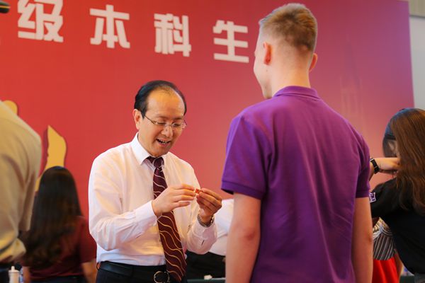 随后,校领导和学院负责人为包括退伍兵、留学生在内的26名新生代表佩戴校徽。