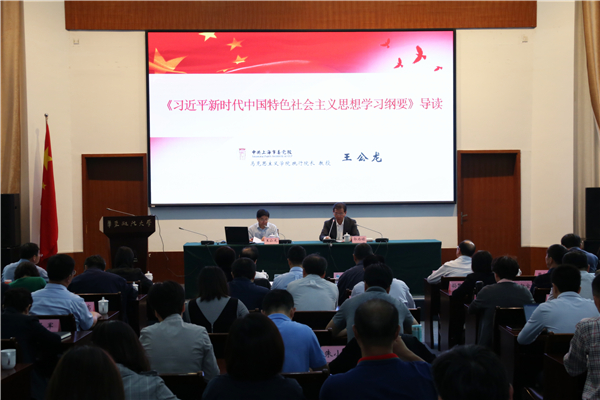 10月9日,校党委领导班子“不忘初心、牢记使命”主题教育第七次集中学习研讨在松江校区举行,上海市委党校马克思主义学院常务副院长王公龙教授应邀作《习近平新时代中国特色社会主义思想学习纲要》解读报告。讲座结束后,班子成员即围绕深入学习《纲要》精神、加强党性修养方面进行集中学习研讨。校党委书记郭为禄主持会议。