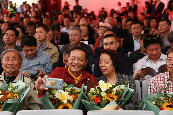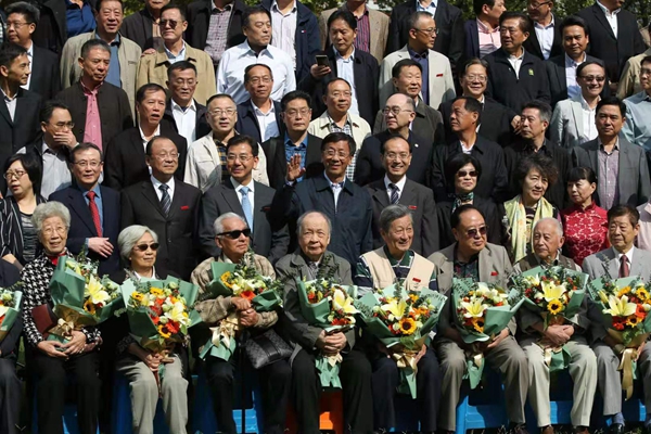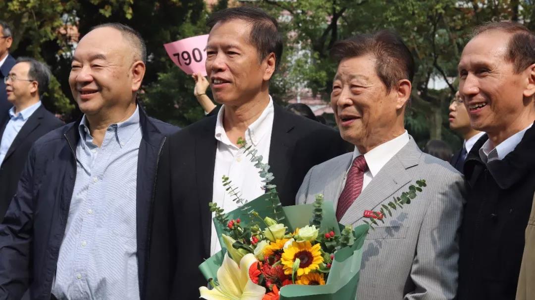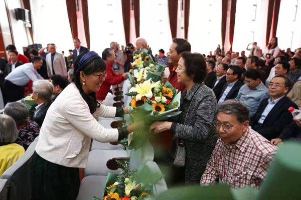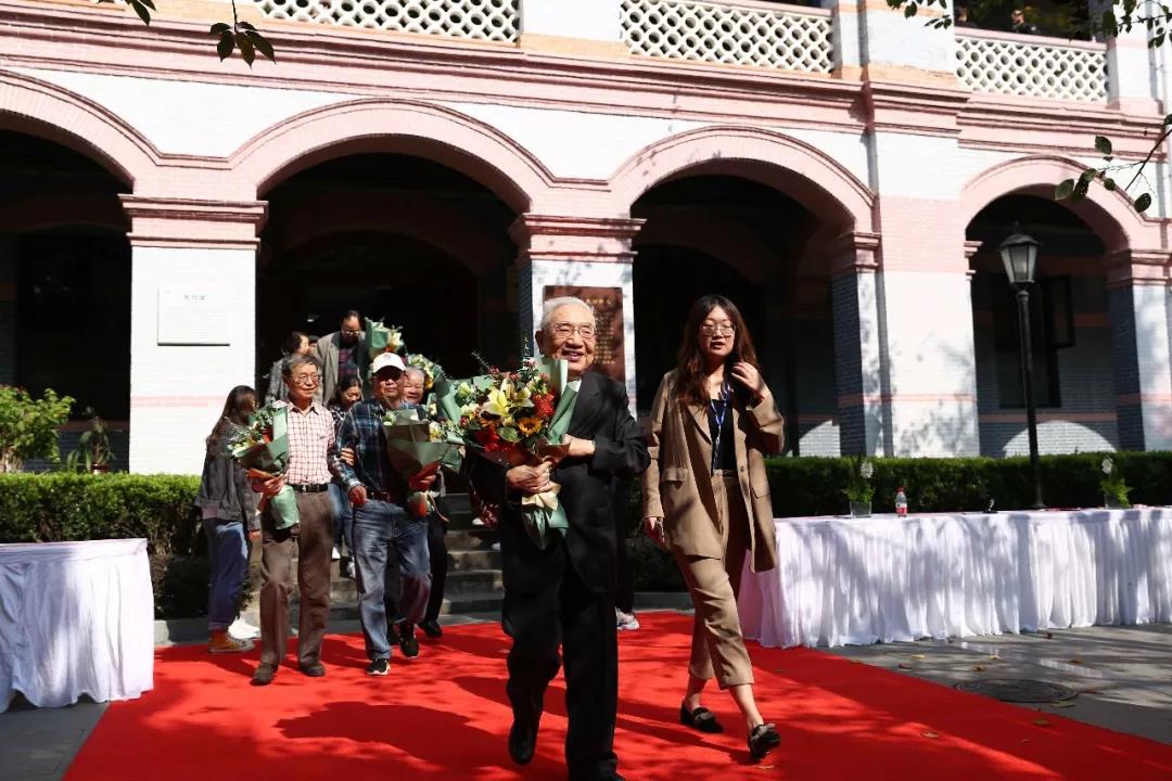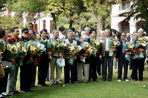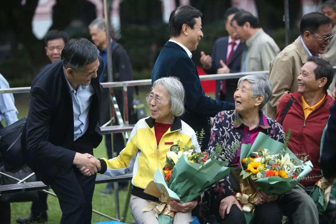 回忆往昔,老师们的谆谆教诲和悉心关怀仍然言犹在耳。当会场的屏幕上出现“亲爱的老师,祝你们永远安康”时,台下响起雷鸣般的热烈掌声。大屏幕滚动播放一张张老照片,昔日的少年已成长为国之栋梁,老师们也被岁月染白了青丝,校友代表起身,将怀中的鲜花献给最敬爱的老师。