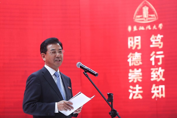 校党委书记郭为禄在致辞中表示复校时的华政,“一切为了教学一线”,功勋卓著的老革命、老干部驻扎帐篷,用艰苦奋斗的精神诠释了“以教学为中心、以教师为第一、以学生为根本”的办学理念。华政“两落三起”的艰辛历程,铸就了华政的独特品格,这就是“逆境中崛起,忧患中奋进,辉煌中卓越”的华政精神。79级在华政的历史文化传承中,发挥了承上启下的关键作用。79级是华政精神的创造者,是华政新起点的火炬手。郭为禄表示,学校的发展为了学生的成长,学生的成长就是学校的发展。华政的今天,凝聚着几代华政人的心血。华政的未来属于一届又一届的新生,也属于一届又一届的毕业生。华政的更好发展是华政人的共同心愿,也是华政人的共同责任。