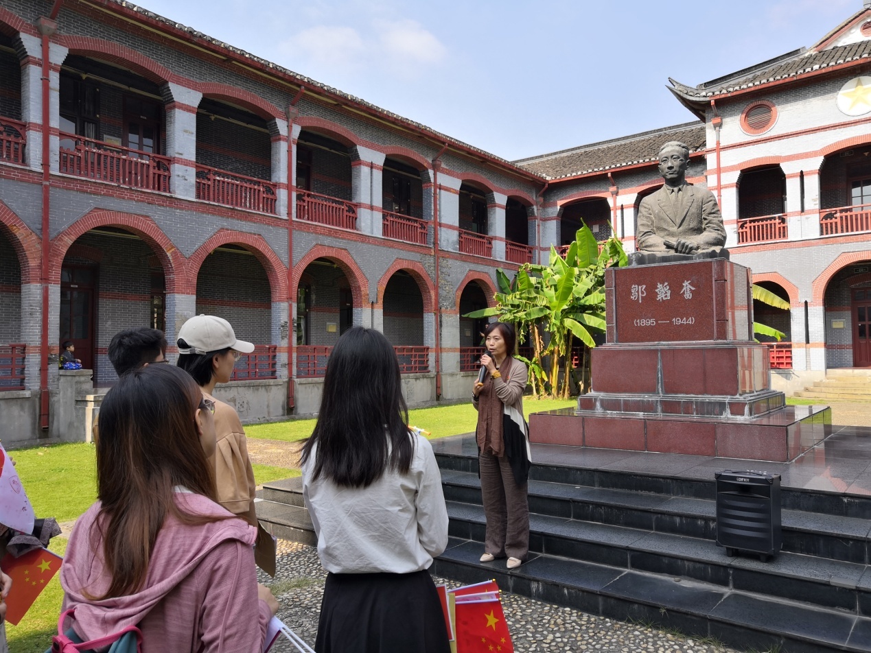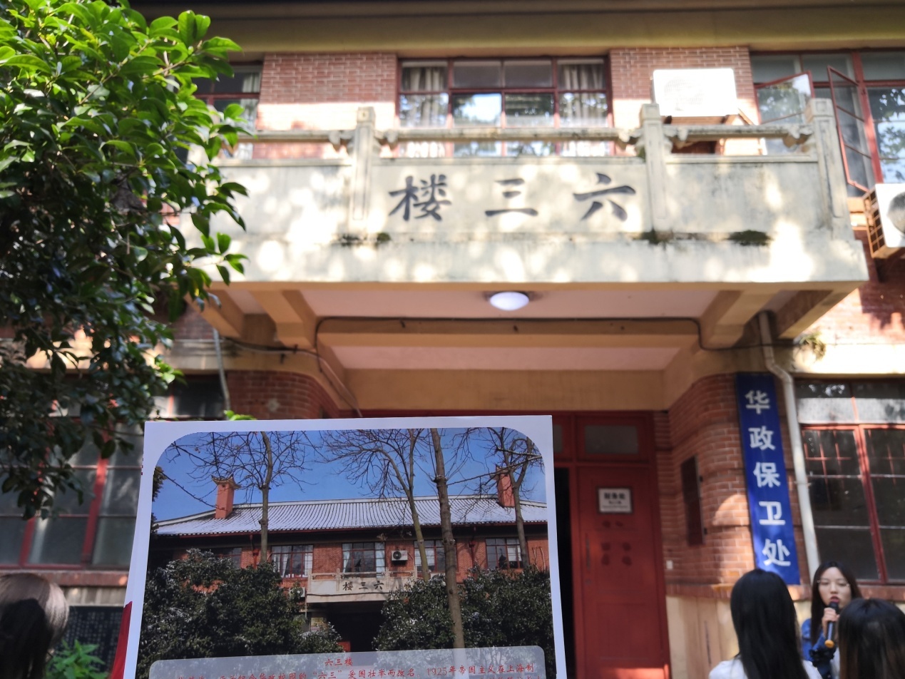 六三楼前,研1826班奕慧龄同学为大家讲解了六三楼名字的来源以及背后所蕴藏的红色故事“五卅惨案”。1925年6月2日,为进行爱国声援和反帝斗争,以孟宪承为首的17名教职员及553名学生6月3日愤然离开,组建了光华大学。这一离校事件就是“六三”事件,“六三楼”因此而来。刘丹华对此作了补充,她在六三楼前的旗墩前指出,“五卅惨案”就是因为当年圣约翰大学学子想要在此降半旗致哀顾正红,爱国热情空前高涨。通过刘老师和奕慧龄同学的讲解,不仅使学生对于六三楼的红色故事有了深入了解,更激发了学生的爱国情怀。