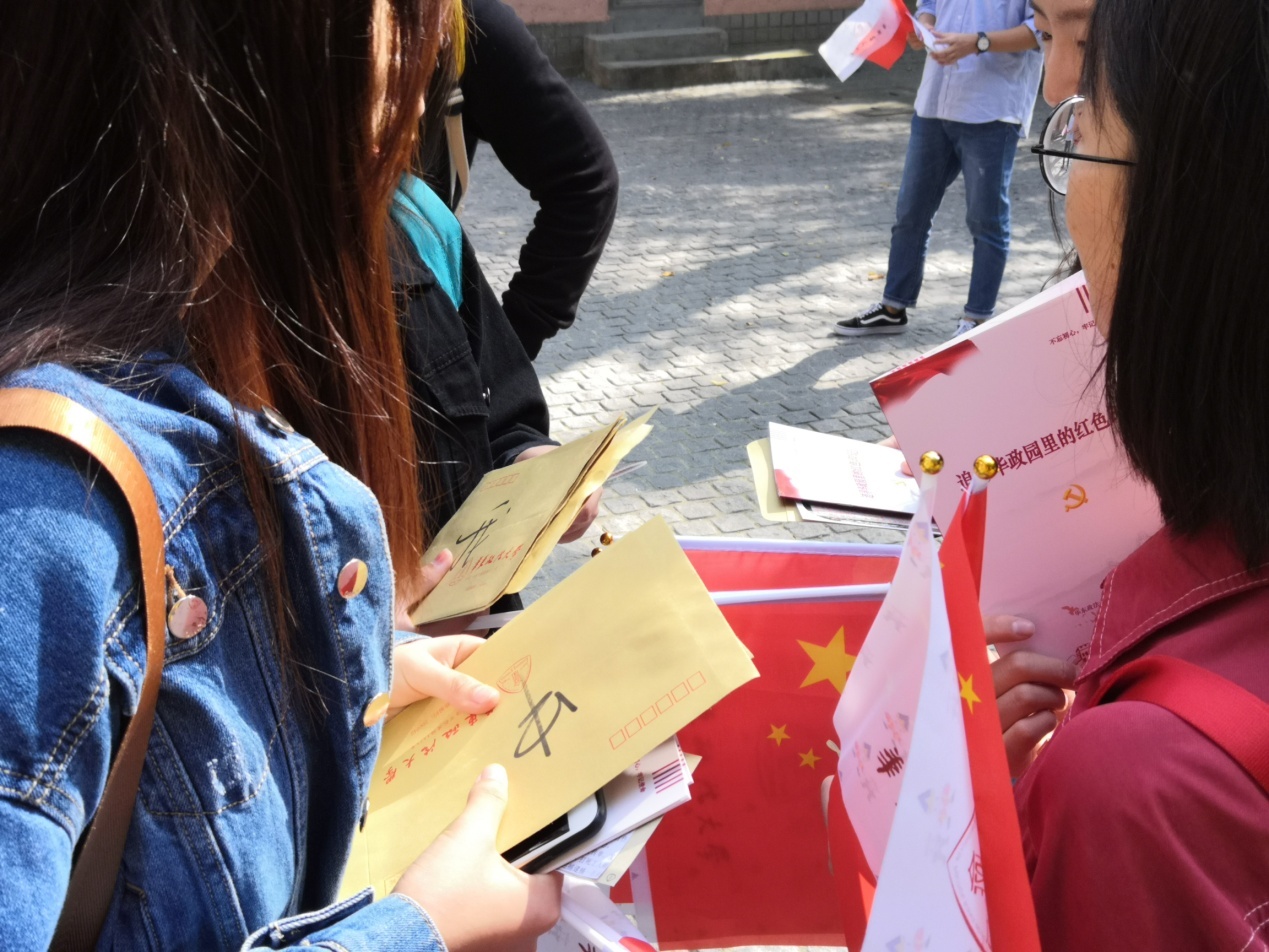 在“探寻红色印记”阶段,学生被分为五个小组,每个小组在规定时间内前往交谊楼、四号楼前草坪、六三楼、四十号楼和韬奋楼等特色建筑,寻找隐藏在校园内优秀历史建筑中的五个红色印记信封,信封内分别装有一张卡片,卡片的正面为每栋楼的照片及简介,背面分别为“我爱你中国”五个字,最终将拼图集齐后拼成“我爱你中国”。