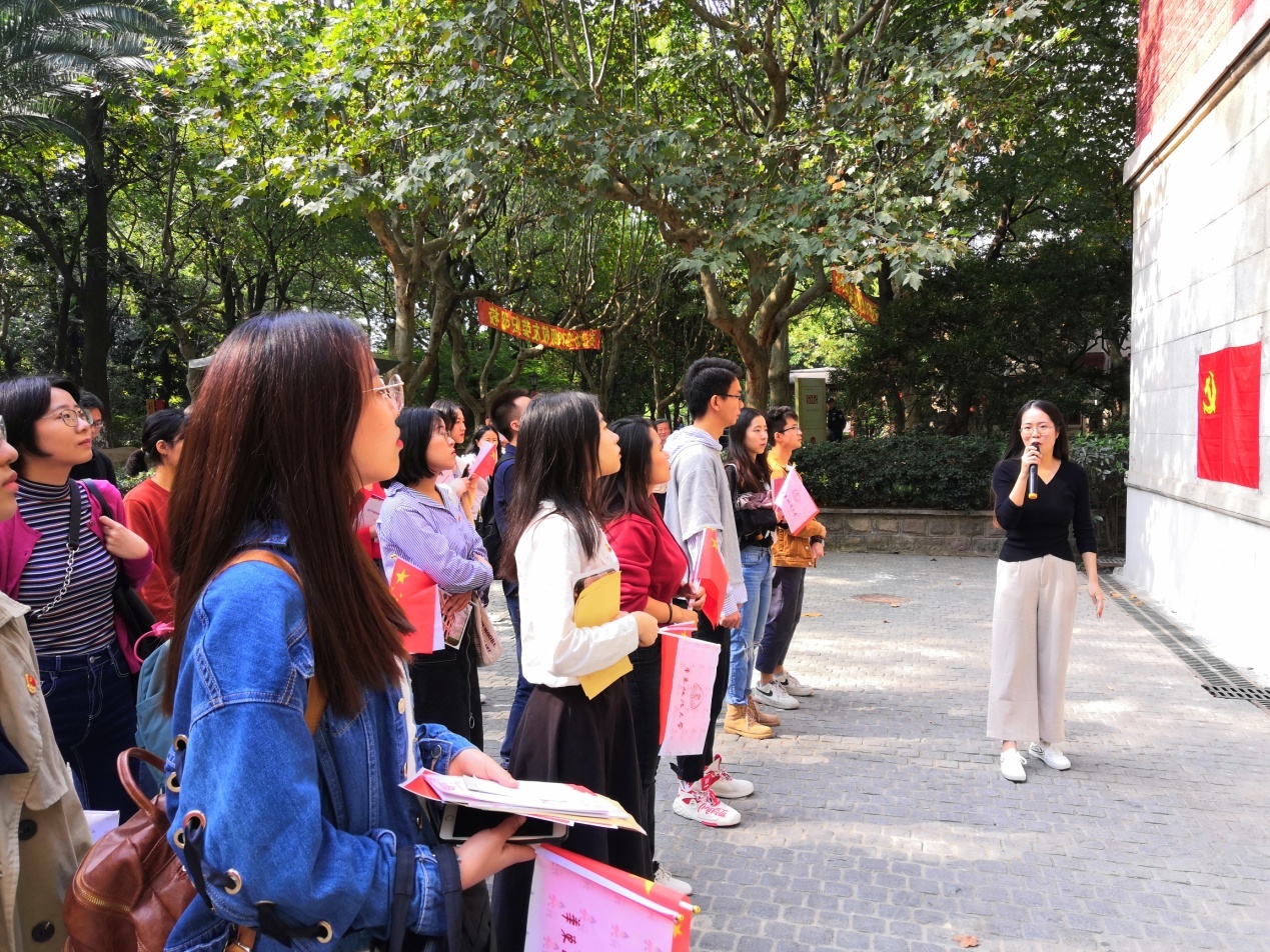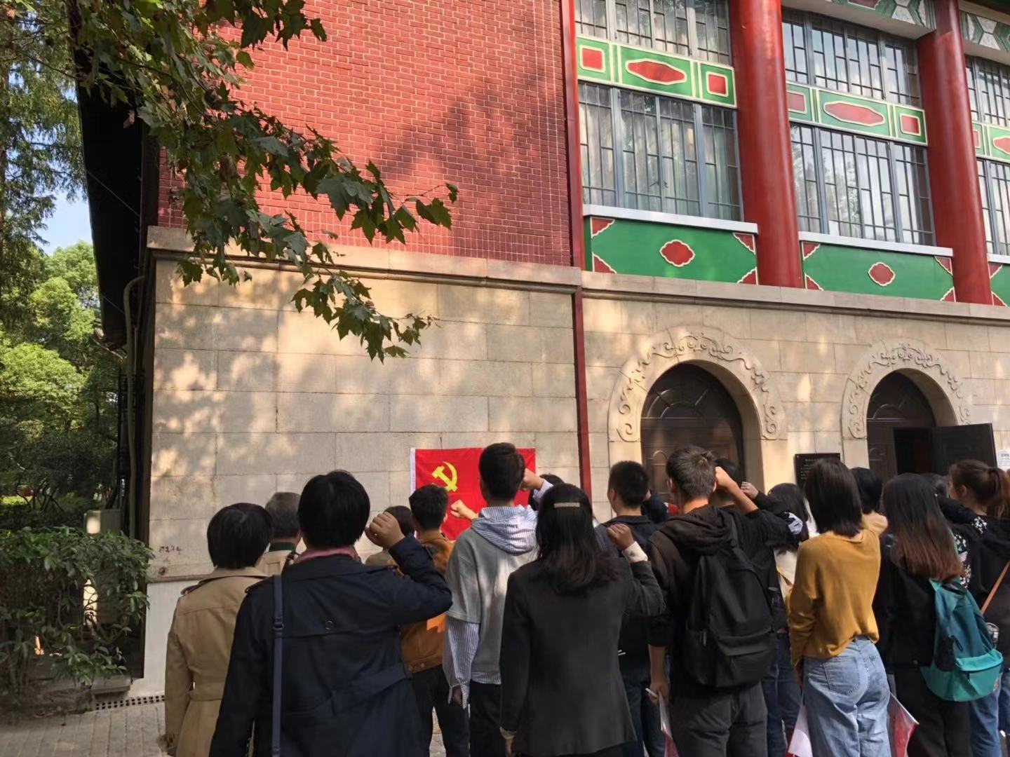 在统一参观前,学生党员在曾经解放军解放上海第一宿营地——交谊楼,这一具有特殊历史意义的建筑前,在研究生教育院党委书记刘丹华老师的带领下,面向党旗庄严宣誓。当大家再次铿锵有力地说出入党誓词时,心情都久久不能平静,那一丝家国情怀萦绕在所有同学心头。站在党旗下,大家更加坚定了要不忘初心,为人民谋幸福、为民族谋复兴的伟大使命。
