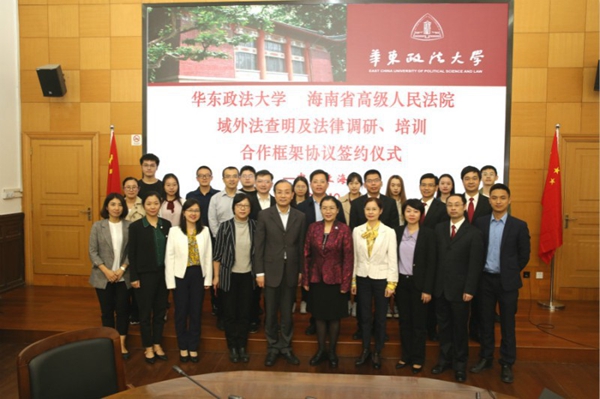 10月16日下午,我校与海南省高级人民法院在长宁校区就外国法查明、法律调研及培训合作等领域签署合作协议。海南省高级人民法院副院长张玉萍,我校党委副书记、校长叶青和外国法查明研究中心主任林燕萍等出席仪式并讲话。