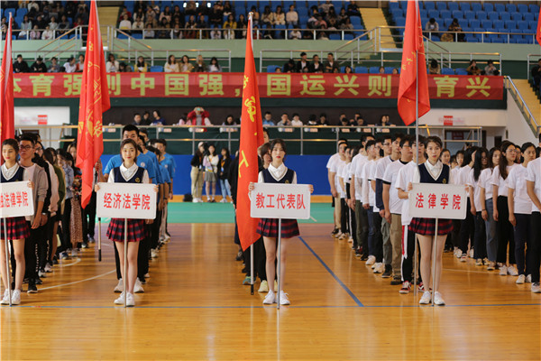 周立志致开幕辞。他指出,发展体育事业不仅是实现中国梦的重要内容,还能为中华民族伟大复兴提供凝心聚气的强大精神力量。重视开展体育教育和体育运动是华政的优良传统,学校始终把体育工作放在事业发展的重要位置,坚持育人至上、人格体魄并重的理念,把体育精神融入到人才培养全过程。未来学校将继续深化体育教学改革,着力提升体育教育质量,加快各类体育场馆设施建设,努力为师生参与体育锻炼创造更好的条件和环境。希望在新中国成立70周年,也是学校复校40周年之际举办的本届校运会,能够进一步激发全体师生热爱体育运动、增进身心健康的热情,营造“积极向上、丰富多彩、健康和谐”的文化氛围,提升学校办学治校的内涵和水平。