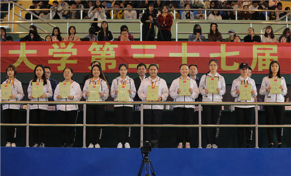 郭为禄、张明军、周立志、曲玉梁、杨忠孝、金其荣为2019年优秀校级运动队颁奖。其中,高水平棒球队获2019全国大学生棒球锦标赛冠军;女子板球队获2019年全国板球锦标赛(女子推广组)冠军;男子篮球队获2019上海市校园篮球联盟杯赛冠军;田径队获2019上海市大学生田径联盟杯赛女子100米第一名、女子4*100米接力第一名等优异成绩。随后来自校礼仪队、唯舞艺协、武协空手道、健美操、体育舞蹈队等社团的代表们进行了精彩展示。