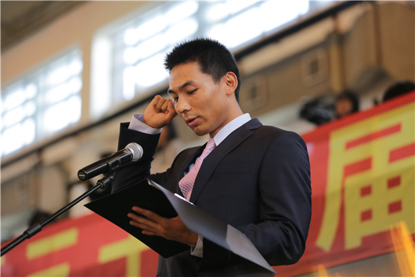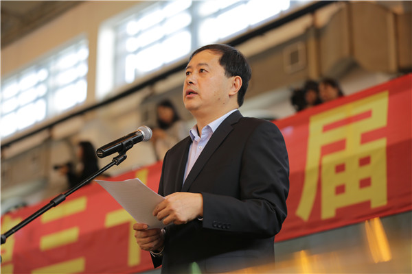 体育部教师朱建明和校高水平足球队队员杨硕分别代表本届校运会裁判员和运动员进行了宣誓。郭为禄宣布运动会开幕。