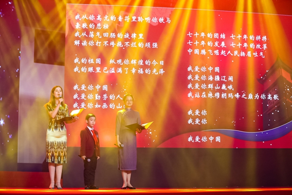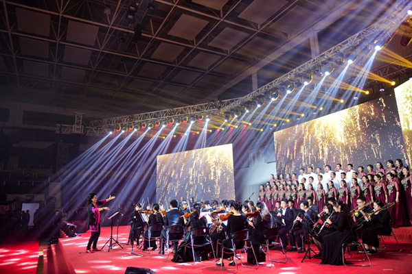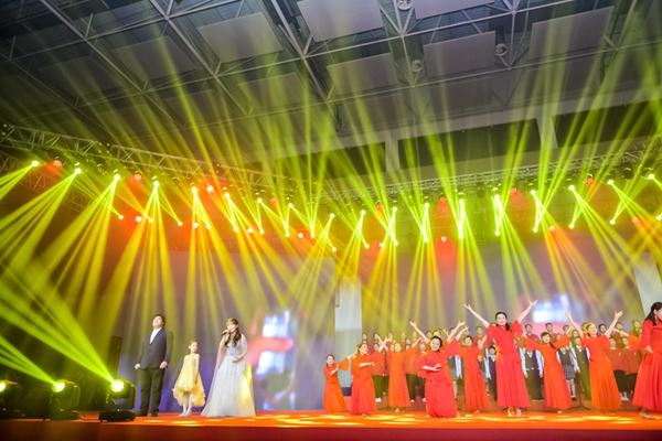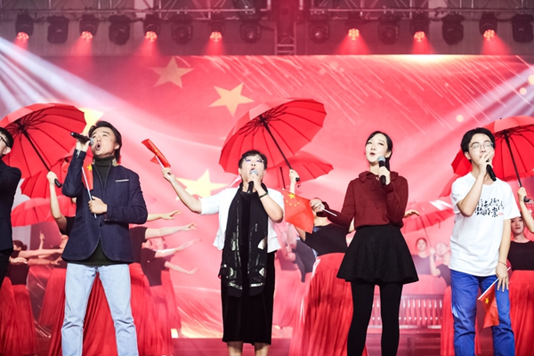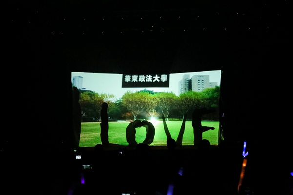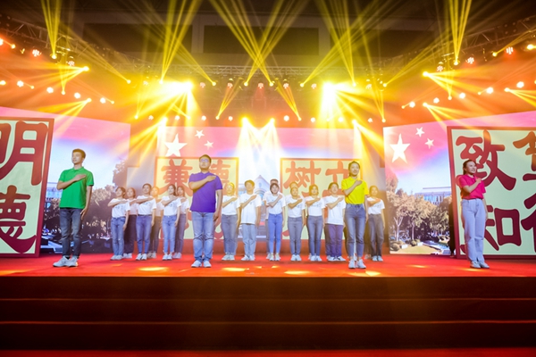“芳草地,红砖墙……”校领导与教工合唱团合唱校歌《明珠之光》将晚会推向高潮,在场全体师生和校友随节目共同演唱,歌声激昂,豪情满怀,表达了对华政、对伟大祖国的无限热爱和深情祝福。