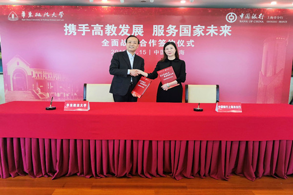 11月15日,我校与中国银行上海市分行签署全面战略合作协议。校党委副书记、校长叶青,校党委副书记、纪委书记应培礼,副校长周立志,中国银行上海市分行行长赵蓉、纪委书记张剑光、资深客户经理杨军,以及双方相关部门负责人出席签约仪式。