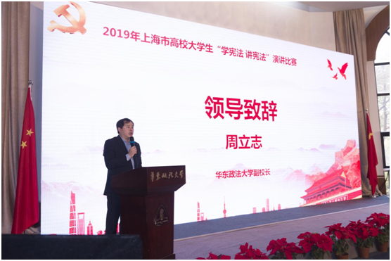 11月24日,2019年全国学生“学宪法讲宪法”上海赛区(大学生组)演讲比赛在我校举办。本次比赛由上海市教育委员会主办、我校承办、律师学院协办。上海市教育委员会政策法规处处长、法宣办主任王磊,政策法规处副处长李进付、副教研员陆海佳,我校宪法教研室主任朱应平,上海政法学院宪法与行政法教研室主任陈海萍,上海视觉艺术学院播音主持专业田奇蕊教授,华东师范大学法学院实验实践教学中心副主任黄翔,北京观韬中茂律师事务所合伙人周乐多,上海浦东东方语言文化发展研究院院长桂志诚应邀担任评委。我校副校长周立志为比赛致辞。