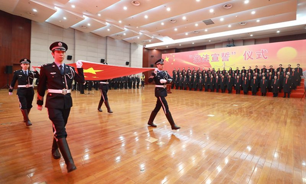 下午1时30分,市高院法官宪法宣誓仪式正式开始。仪式由市高院党组成员、政治部主任陆卫民主持,市高院领导、部分全国政协委员、市人大代表、部分新闻媒体记者等出席活动。市高院党组书记、院长刘晓云受市人大常委会委托向今年新任命的法官颁发了任命书,并带领85名新任命法官面对国旗、国徽庄严宣誓,作出忠于宪法、忠于祖国、忠于人民的庄严承诺。宣誓后,两名法官代表依次发言。声声庄严的宣誓、铿锵有力的发言,彰显了法官的职业尊荣感、使命感和责任感。
