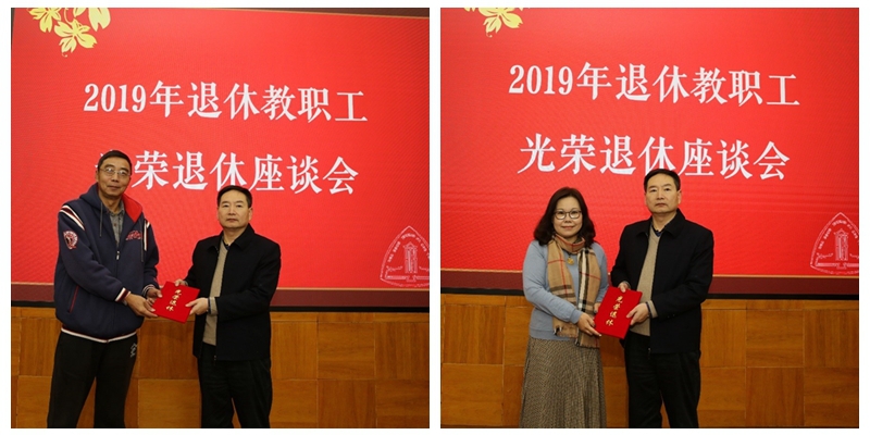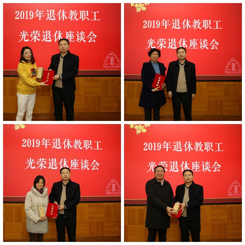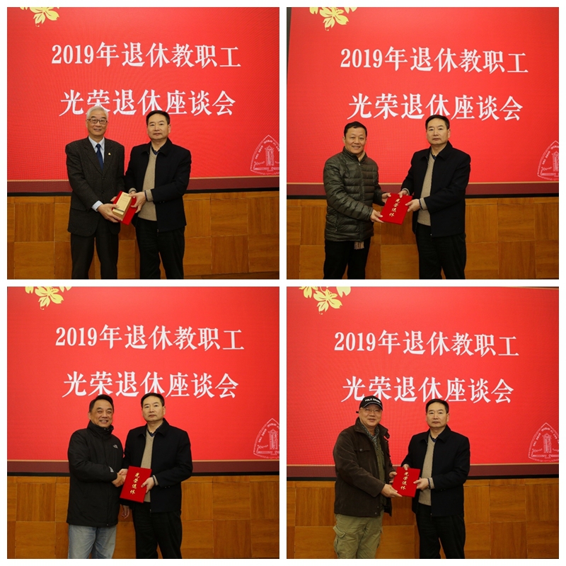 高玉明介绍了2019年教职工退休情况。张明军为每位与会退休教职工颁发光荣退休证并赠送纪念品,部门、学院领导向退休教职工献花,表达感谢、祝福之意。