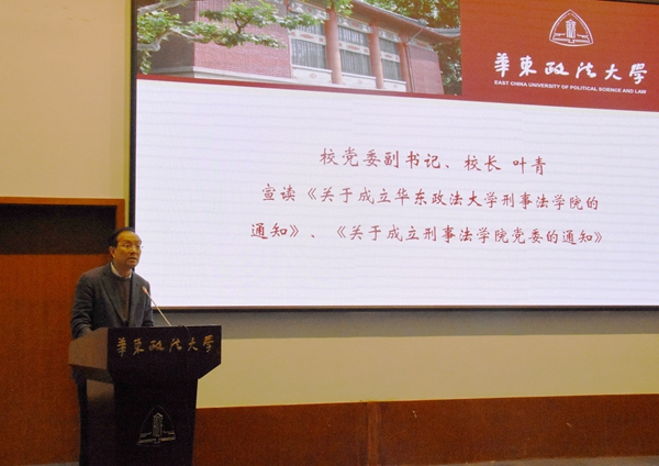 叶青宣读《关于成立华东政法大学刑事法学院的通知》和《关于成立刑事法学院党委的通知》。校党委常委、党委组织部部长戴莹宣读《关于王永全等同志任职的通知》和《关于孙万怀等同志职务任免的通知》。