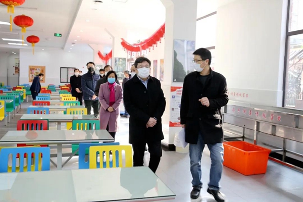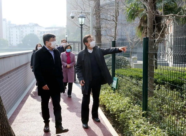 陈群视察了师生出入口、宿舍、食堂、苏州河步道等卫生防疫情况。在万航渡路校门进口处的测温区域,陈群接受测温并了解师生进出管理办法。