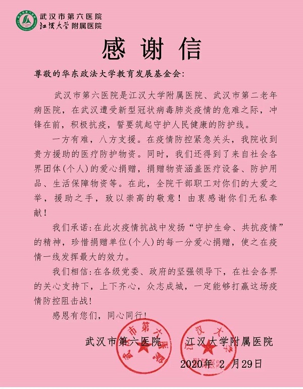 我校“防疫基金”筹集和采购取得了预期效果,先后收到武汉第六医院、武汉协和医院、天门第一人民医院、上海第一人民医院、上海长征医院等5封感谢信。采购小组利用校友会微信平台连续发布10期公示,第一时间公布采购细节,宣传感人事迹,赢得校友一致肯定,共收到校友留言2612条。2月14日,《新民晚报》报道“为国采购,向国表白——华政校友全球联动齐心抗疫”,上海教育等新媒体平台也对我校防疫基金工作进行报道,赢得较好社会评价。