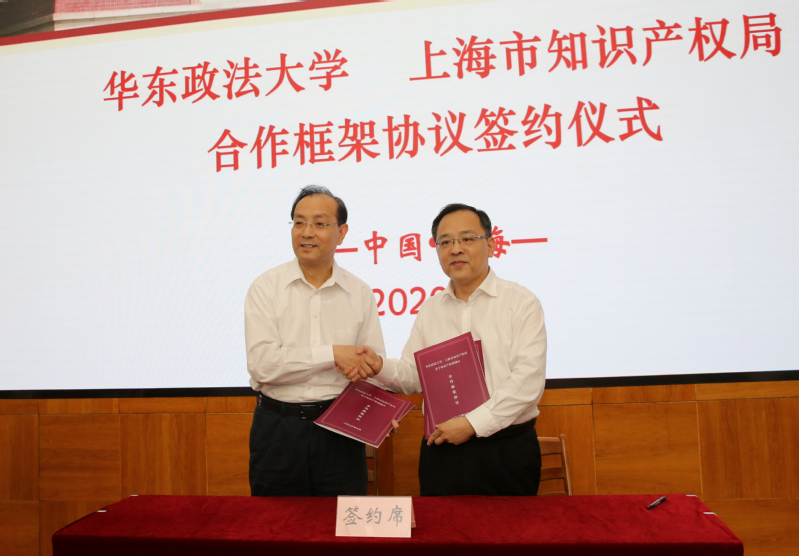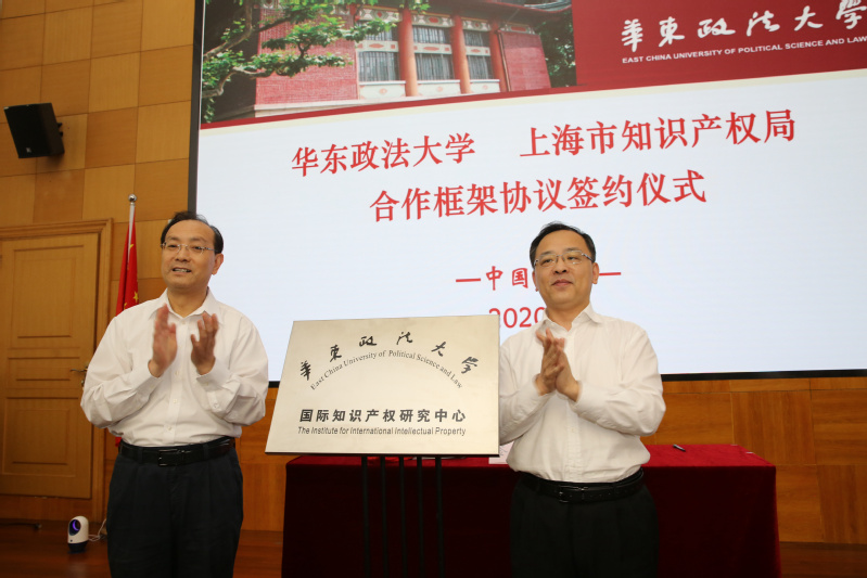 叶青和芮文彪代表双方签署框架合作协议,并为华政国际知识产权研究中心揭牌。