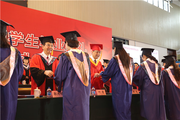 与会领导、老师为毕业生代表授予学位。
