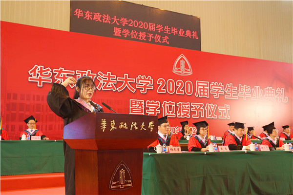 陈晶莹、张明军分别宣读《华东政法大学关于授予学士学位、硕士学位、博士学位的决定》和《关于授予2020届“上海市普通高等学校优秀毕业生”“华东政法大学优秀毕业生”荣誉称号的通知》。