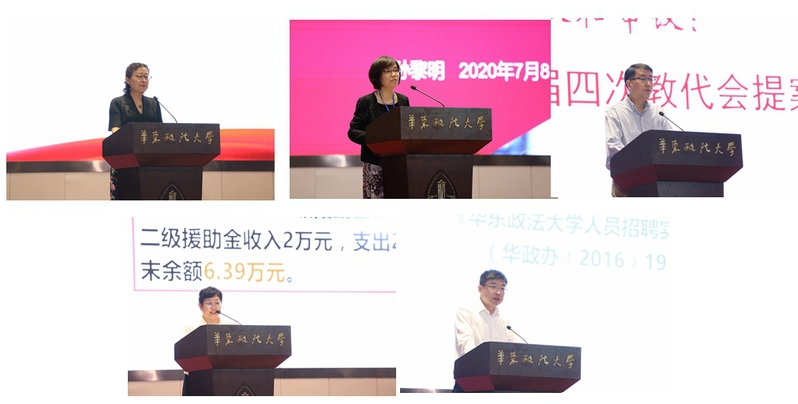 会上,黄岳峥、孙黎明、巢立明、邵军、韩强分别对八届六次教代会代表团成员变动、《校财务工作报告》《八届四次教代会提案工作报告(草案)》《华东政法大学工会2019年度经费收支决算说明》《专职研究人员转聘专任教师的相关政策解读》作了解读;与会人员书面审议了修订后的《华东政法大学帮困基金章程》、修订后的《华东政法大学教职工重大疾病、住院医疗补助办法》;书面审议《华东政法大学“爱心一日捐”经费使用管理办法(草案)》。