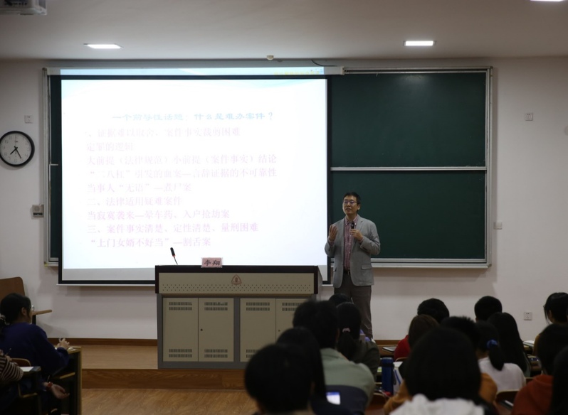 李翔向同学们抛出了“什么是难办案件”这一问题,重点从三个方面对“难办案件”进行了阐述。一是证据难以取舍,案件事实裁定困难。李翔提出,定罪逻辑是“大前提(法律规范)——小前提(案件事实)——结论”。借助两个案件,李翔讲述了言辞证据相矛盾和当事人“无语”情况下的难办案件。二是法律适用疑难案件。以行为人“以卖淫嫖娼为由入户抢劫”案件为例,李翔讲述了现实实践中法律适用遇到的困难。三是案件事实清楚、定性清楚,但量刑困难。李翔提出,量刑困难不仅是理论问题,同时也是实践问题。以“上门女婿割舌案”为例,李翔讲述了现实实践中量刑遇到的困难。除此之外,还包括公众质疑与司法权威的对立、司法解释带来的难办案件等。