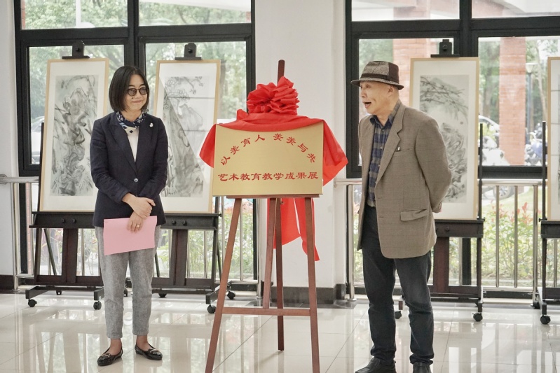 在与会师生的掌声中,唐波、王恬共同为艺术教育教学成果展揭幕。