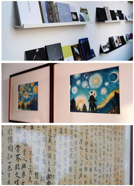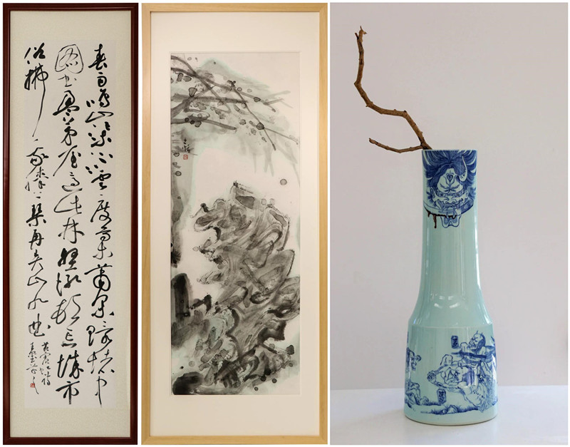 从左到右依次为王玺老师书法作品、王恬老师绘画作品、冯胤老师陶艺作品