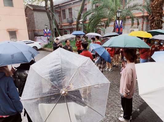 “这座40号楼也是充满红色故事的一幢楼,孙中山先生曾在此演讲,论说了科学教育的重要性。”张磊教授带领同学们在微雨中穿梭百年华政园,在行走之中学习“四史”。华政园的红色历史画卷徐徐展开:硝烟尚未散去的交谊楼前,陈毅元帅带领解放军指战员们在这里住宿;办公楼大草坪前,老一辈华政教师在这里支起帐篷为学生服务;颇具数学韵味的六三楼,其实是一座师生爱国运动纪念地……一幢幢、一件件,不仅是华政园历史的缩影,同时也是共和国发展的见证。