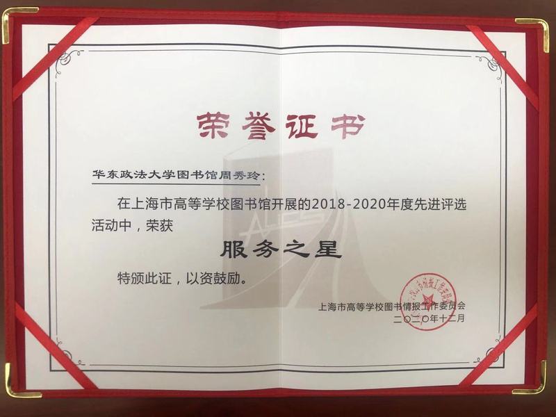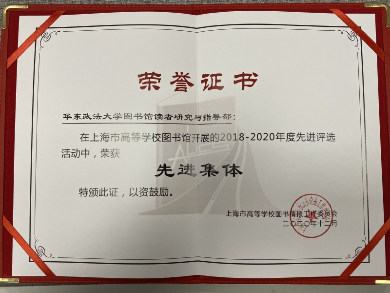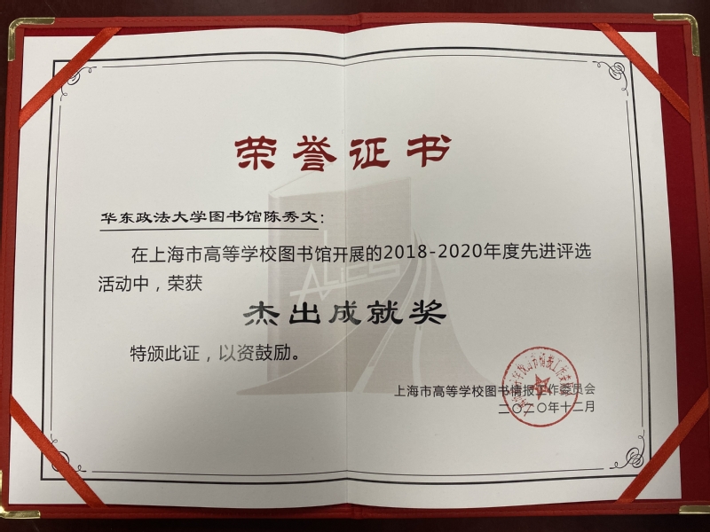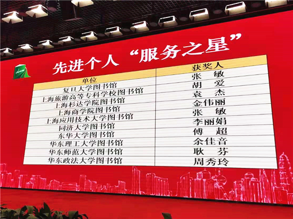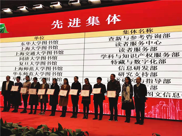 会上宣读了2018—2020年度上海高校图书馆先进个人及集体评选表彰决定,我校图书馆陈秀文老师从60余所高校图书馆候选人中脱颖而出,荣获“杰出成就”奖;我校图书馆周秀玲老师荣获“服务之星”,读者研究与指导部荣获“先进集体”。