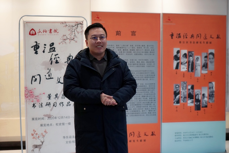 12月16日下午,文伯书院在松江校区校史馆序厅举办“重温经典 问道文敏”董其昌书法研习作品展开展仪式。校党委副书记、纪委书记应培礼,档案馆馆长朱敏,宣传部副部长、新闻中心副主任李馥华,文伯书院党政班子、教师代表、“百外书社”学生代表参加活动。活动由文伯书院党总支书记兼副院长寿新宝主持。