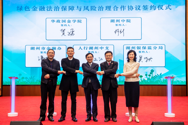国际金融法律学院院长贺小勇,湖州中院党组成员、副院长何新,湖州市金融工作办公室党组成员、副主任潘春晖,中国人民银行湖州中心支行党委委员、副行长郭正江,中国银行保险监督管理委员会湖州监管分局党委委员、副局长吴狄共同签署《绿色金融法治保障与风险治理合作协议》。