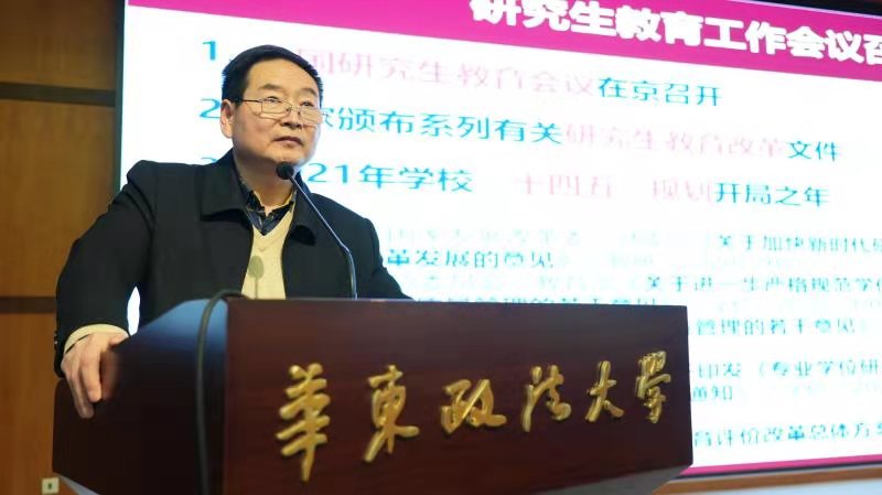 发展规划处处长杨忠孝作“关于深化研究生教育管理体制改革的报告”。在交流发言中,导师代表徐家林老师指出,做好导师,需要处理好一些关系、解决好一些问题。导师对学生有期望,也有责任。导师期望学生学有所成,也有责任使每个同学圆满完成学业、顺利走上社会;要帮助学生找准定位,为未来做好准备;要培养学生全面发展和健康成长;要关心每个学生,不能“偏心”。姚明斌老师认为研究生培养既要重视学问教育,也应重视人格养成;应注意指导学生处理好和自我、他人、专业的三方面关系,培养自我负责、应对挫折的意识,诚实信用、协作沟通的能力,以及负有职业尊严感和创新精神的事业态度;可以探索通过课程建设、论文指导、细节教育、心理辅导等环节实现“为学”与“为人”的互融互济。陈绍玲老师关于法硕(非法本)学习提出建议,指出就本科专业和研究生专业的关系,本科非法学专业不是学习法学专业的优势,是学好法学之后就业和发展的优势;在校学习和校外实习的关系,良好的法学功底是做好校外实习的保障,应该把在校学习而非校外实习放在第一位;专业课程学习和基础课程学习的关系,学好基础课程是学好专业课程的前提,建议法硕(非法本)研究生以跟本科生同学、同考的方式学好法学基础课程。经济法学院院长钱玉林老师强调要提升研究生培养质量进一步优化招生考试制度,例如加大接受硕士推免生的力度,博士生招生采取申请审核制等;推动内涵式发展和国际化教育;改革学习评价制度,加大过程考核,实行综合评价制度,尤其是要注重研究能力的评价。传播学院副院长胡慧源老师结合工作实际,先后从强化价值引领、强化过程监控、强化队伍建设、强化践习指导四个方面详细介绍了传播学院提升新闻传播学科研究生教育质量的多种举措,为兄弟学院提供了有益参考。