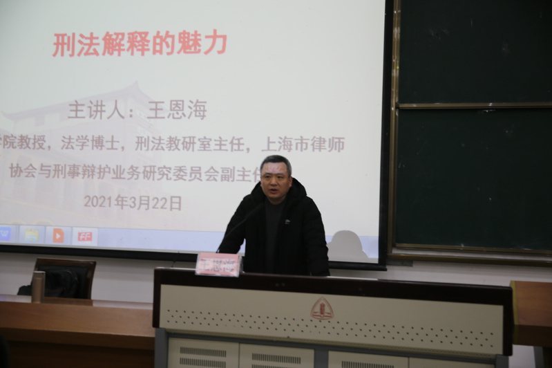 3月22日晚,刑事法学院刑法教研室主任王恩海教授应邀在我校松江校区崇法楼主讲本学期“法治中国”课程第四讲“刑法解释的魅力”,校党委教师工作部部长赵庆寺教授主持。