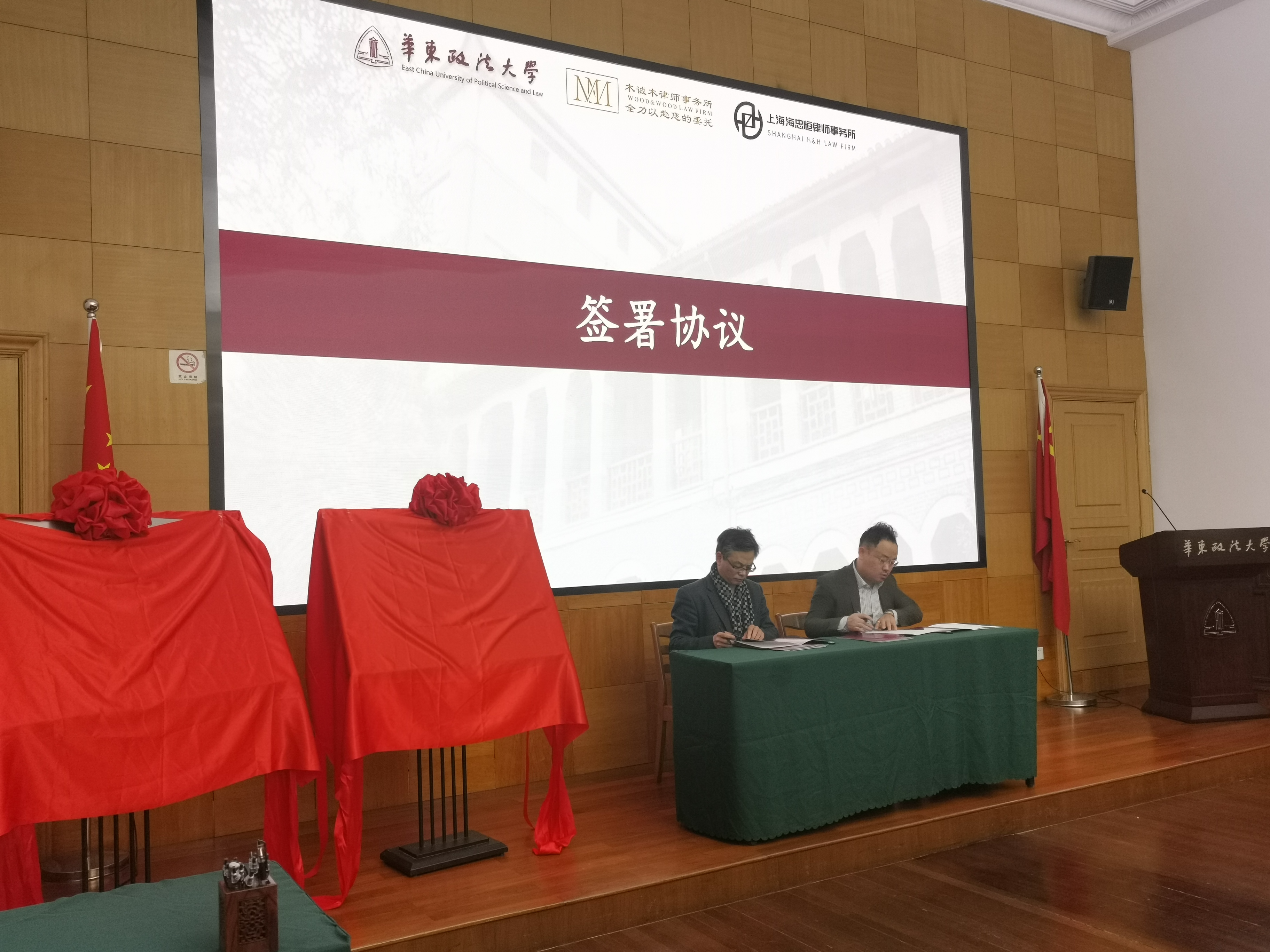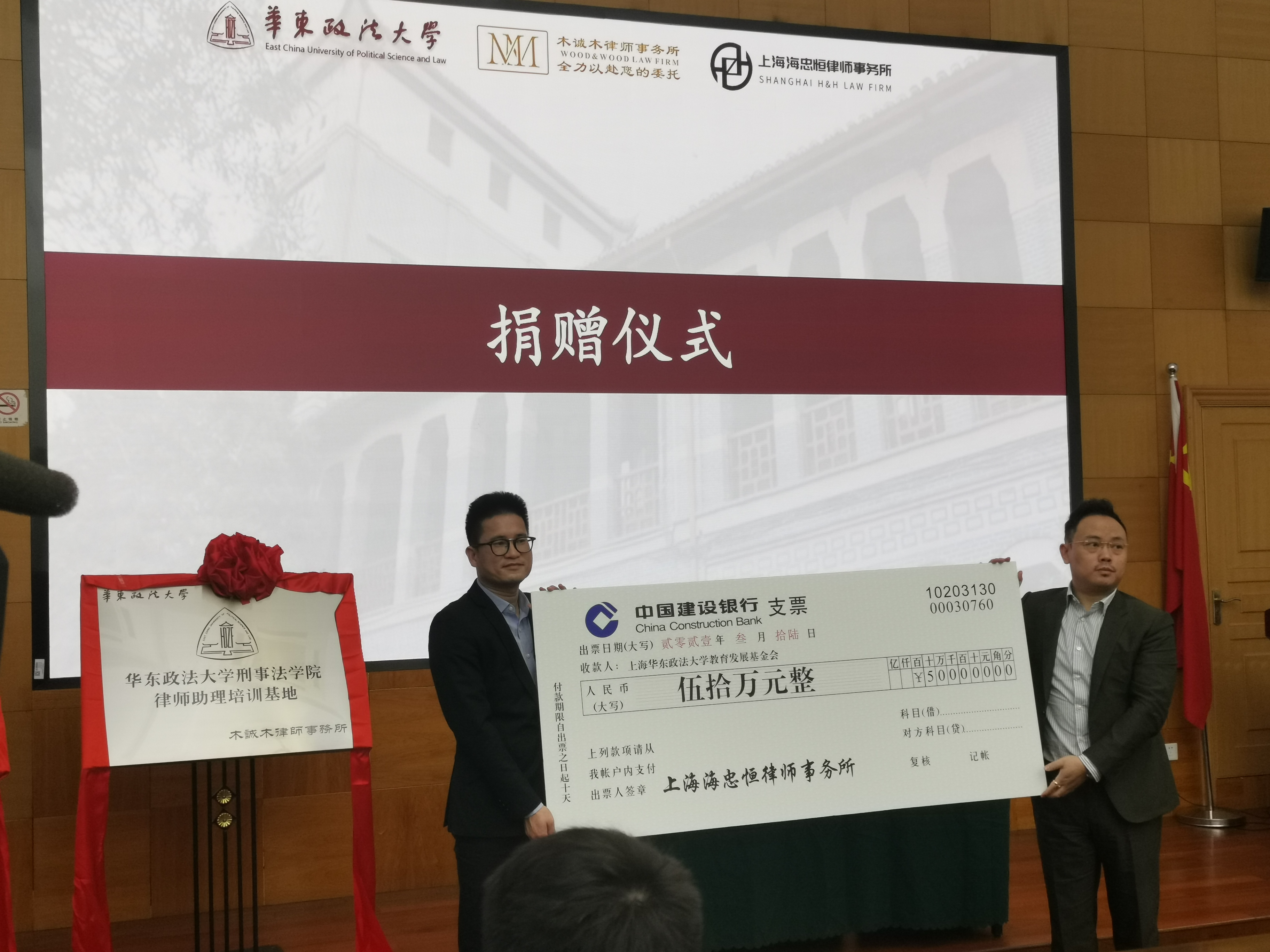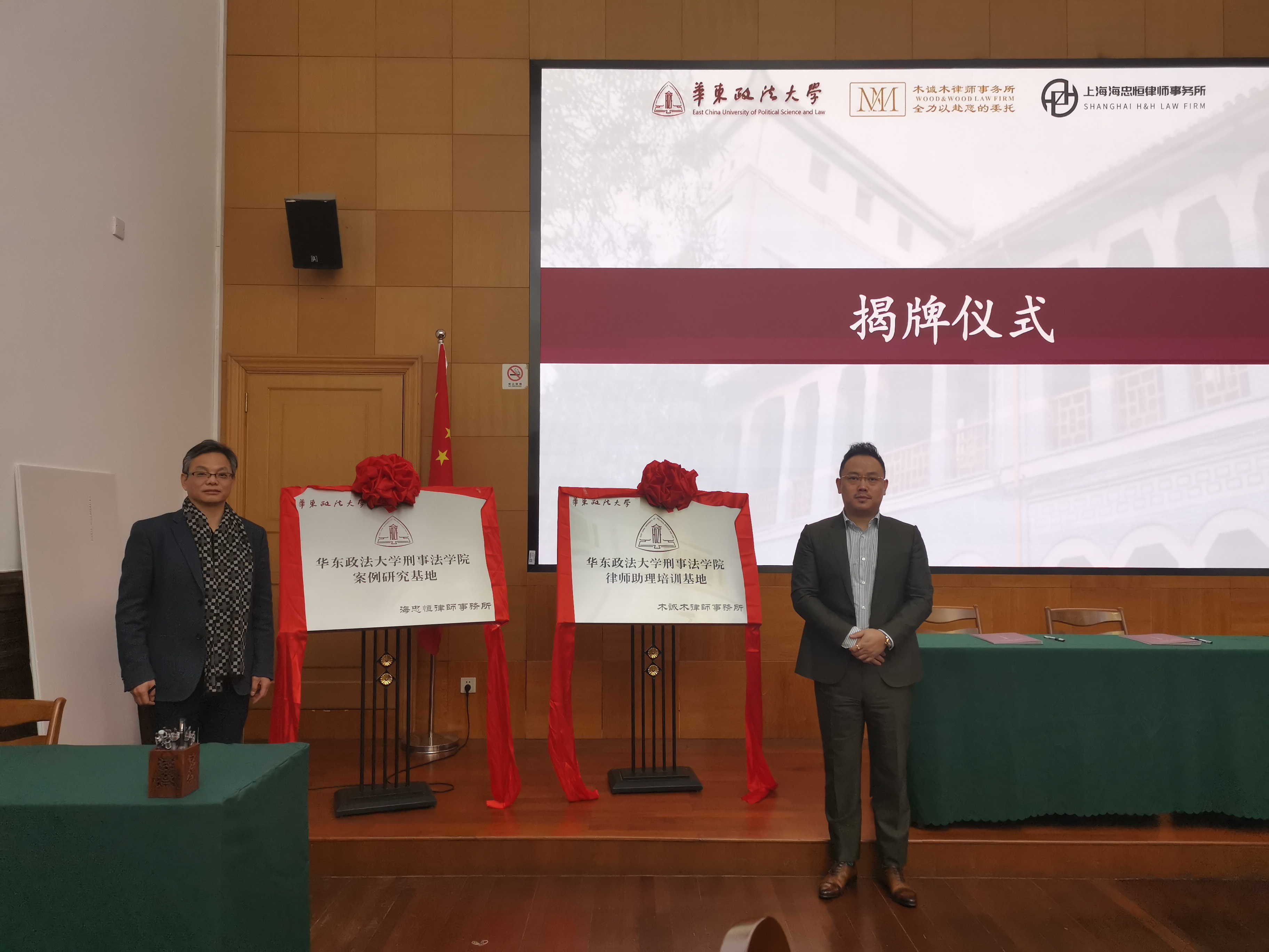 孙万怀与张恒伟代表双方签署战略合作协议,并向海忠恒律师事务所、木诚木律师事务所分别颁授“华东政法大学刑事法学院案例研究基地”与“华东政法大学刑事法学院律师助理培训基地”牌匾。