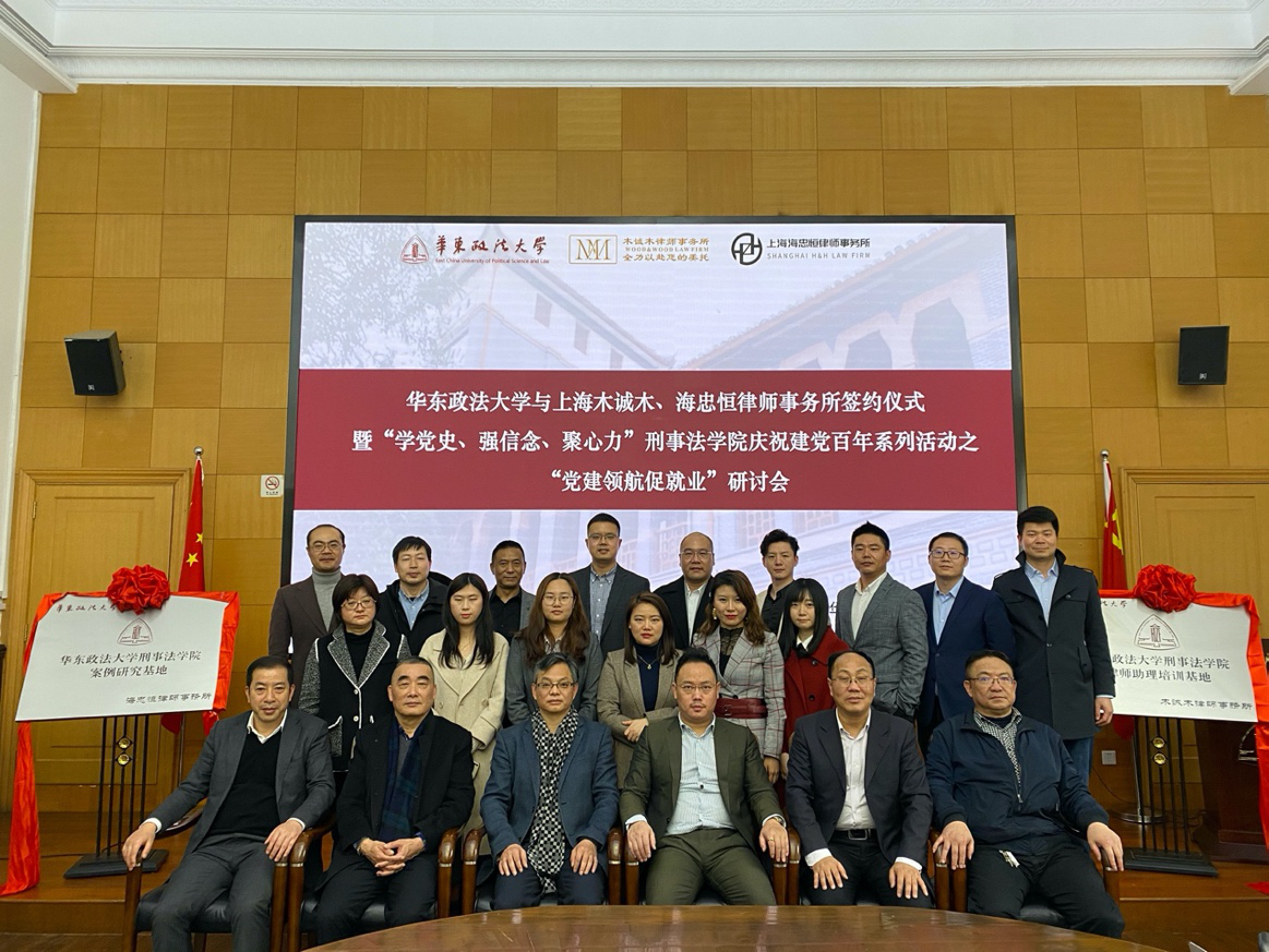 3月16日,由刑事法学院主办,我校与上海木诚木、海忠恒律师事务所签约仪式暨“学党史、强信念、聚心力”刑事法学院庆祝建党百年系列活动之“党建领航促就业”研讨会在长宁校区交谊楼圆桌会议室举办。