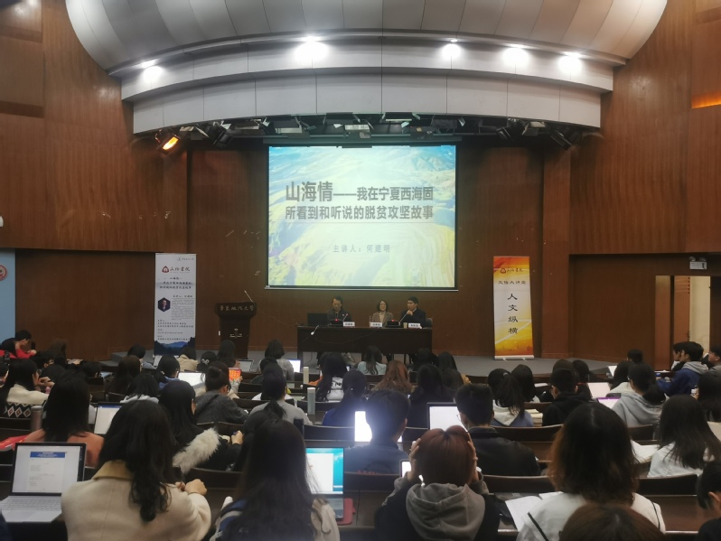 何建明通过多幅西海固贫困写实照片和脱贫后安居乐业的场景照片作为强烈对比,结合讲述几次采访中偶遇的当地扶贫干部故事、村民旅游产业开发、种植养殖产业兴起等蜕变,向在座师生全面呈现了在时任福建省委副书记习近平同志的带领下,经过5年脱贫攻坚战让将近一亿人脱贫的伟大壮举。由此,他对青年一代提出建议,应出去走一走、看一看,亲身体会、感知当今中国一步步的发展脉络。