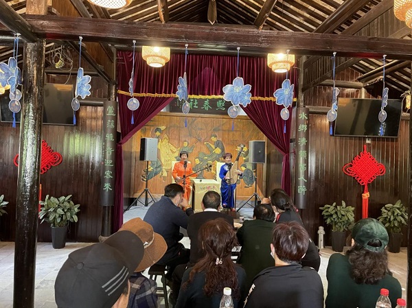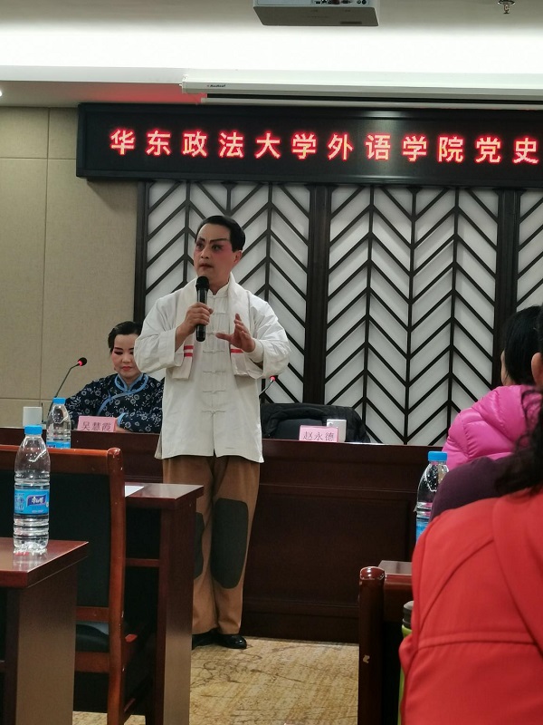 在春来茶馆,教师们听着现代革命京剧《沙家浜》,品着新四军当年喝的芦根茶,感受当年新四军战士抗日救亡的艰苦卓绝,仿佛被先烈的事迹所感染,教师们聊起了自己入党时的一点一滴。